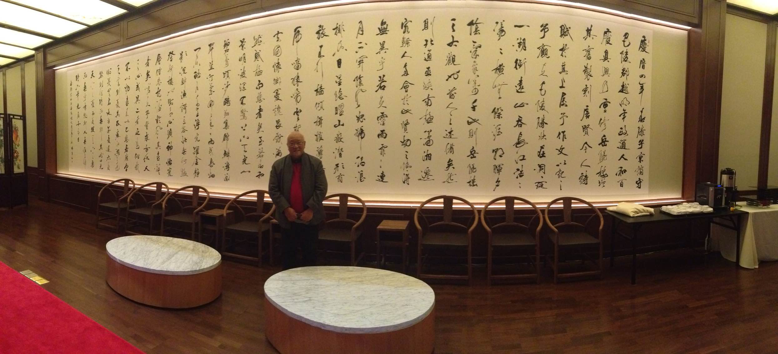 APEC会议期间的《岳阳楼记》和《雁栖赋》以及“一带一路”会议期间的《礼赞丝绸之路》等先生的代表大作,成为雁栖湖国际会议中心内的文化盛景,让我国尽显风采。能做这些为国家增光添彩的大事,实在是极大的成就!